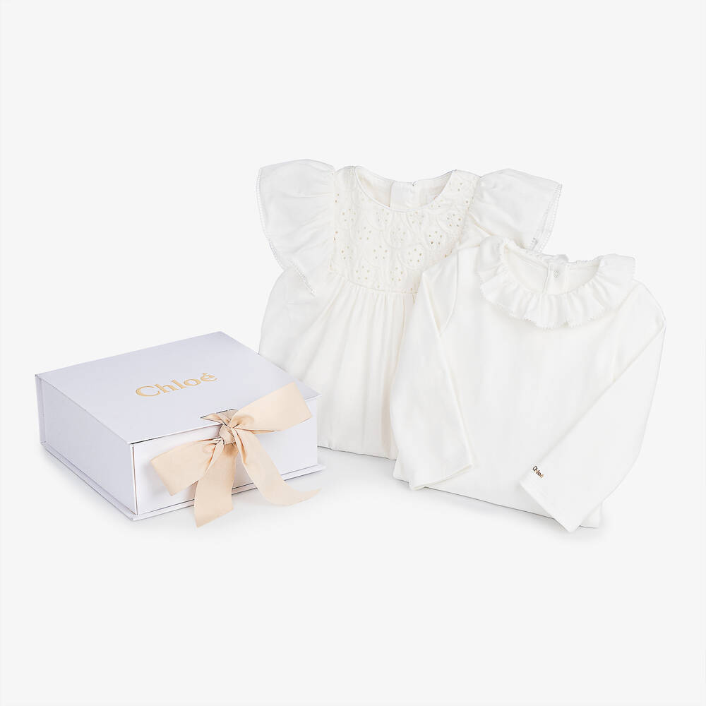 A lovely ivory dress set for baby girls by luxury designer Chloé, made in organic cotton for a beautifully soft feel. Fastening with a zip on the back, the lightweight dress is embroidered with signature flower motifs and scalloped detailing on the upper body. It has delicate jour échelle trims and the Chloé signature logo embroidered above the hem. The bodysuit has a ruffled collar and gold logo lettering printed on one sleeve. Easy poppers fasten on the back and between the legs.