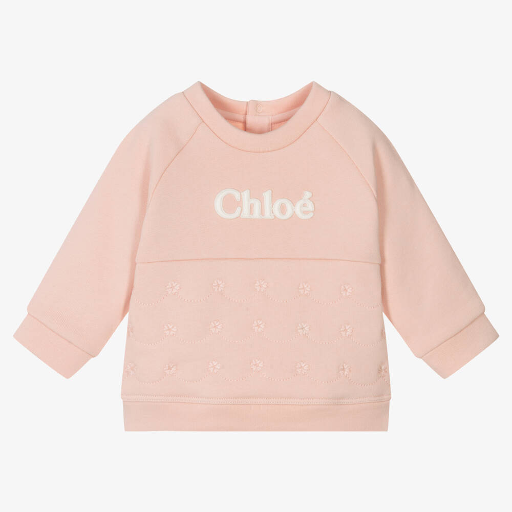 Pretty pale pink organic cotton sweatshirt for little girls by Chloé, made from soft and stretchy jersey with a cosy fleece inside for comfort. Appliquéd to the front is the House's iconic brand name in white, and underneath is a lightly padded panel that is subtly embroidered with a dainty flower chain pattern. This crew neck top has raglan sleeves and fastens on the back with poppers for easy dressing.