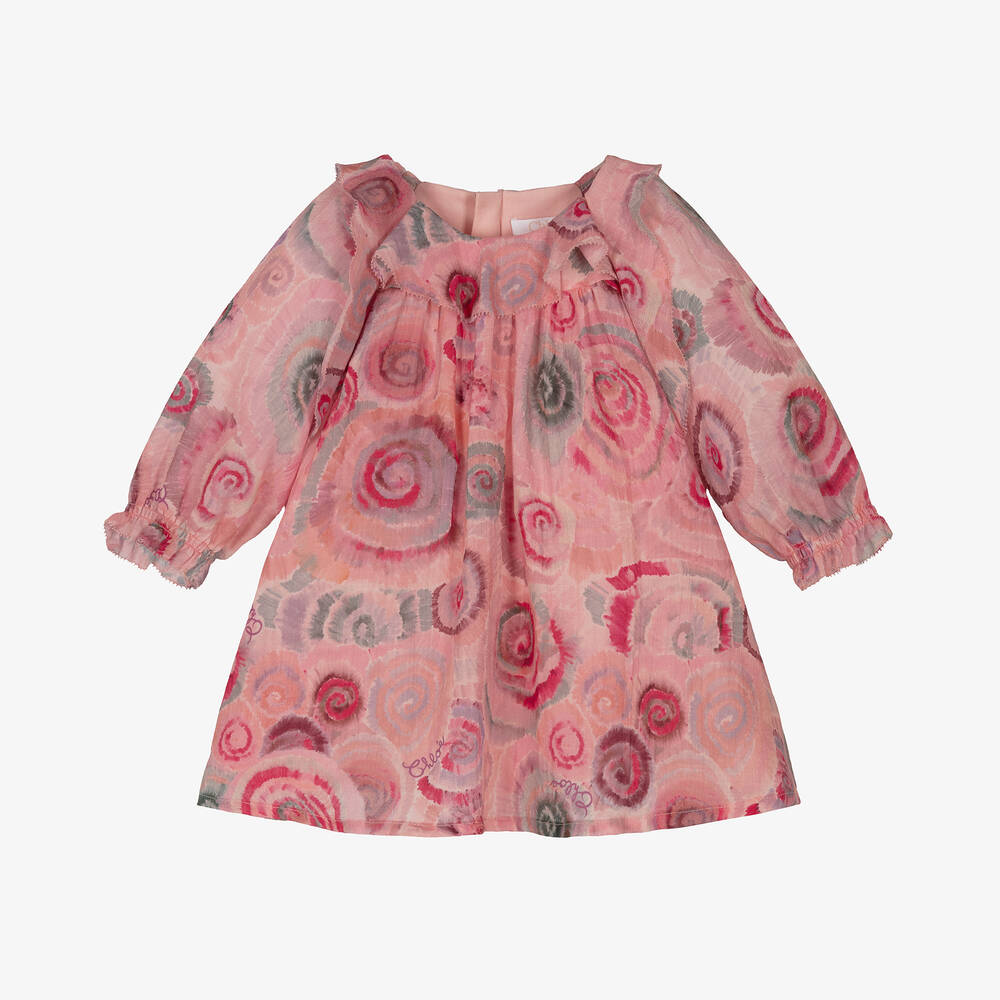 Beautiful pink dress for baby girls by luxury French designer, Chloé. Woven in soft and lightweight wool, this pretty piece has a watercolour spiral print in sweet pastel shades. It has floaty ruffles with delicate embroidered trims and slightly sheer sleeves with fluted cuffs. Lined in soft cotton twill for comfort against the skin, it fastens with a concealed zip on the back.