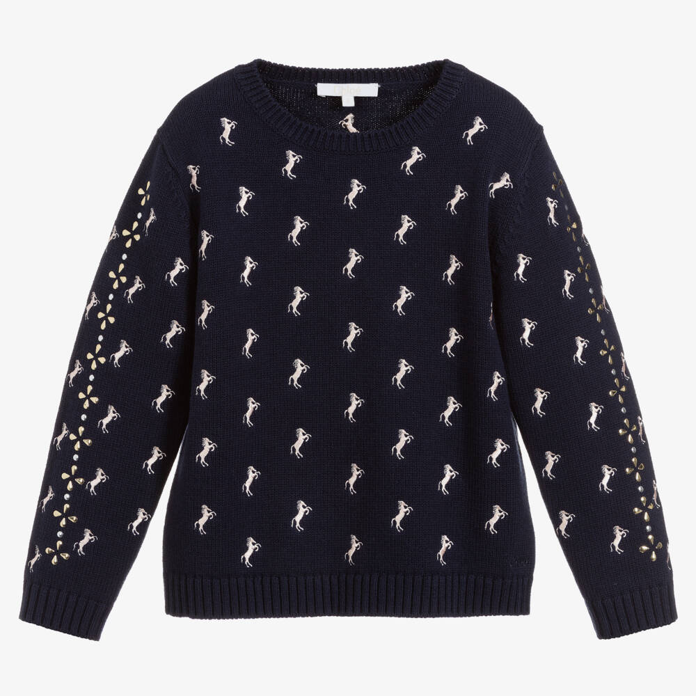 Girls stylish Mini-me navy blue sweater, by French luxury brand, Chloé. Knitted in a soft, mid-weight blend of cotton and wool, it has the brand's signature horse embroidery in shell pink, with silver and gold studs on the arms.