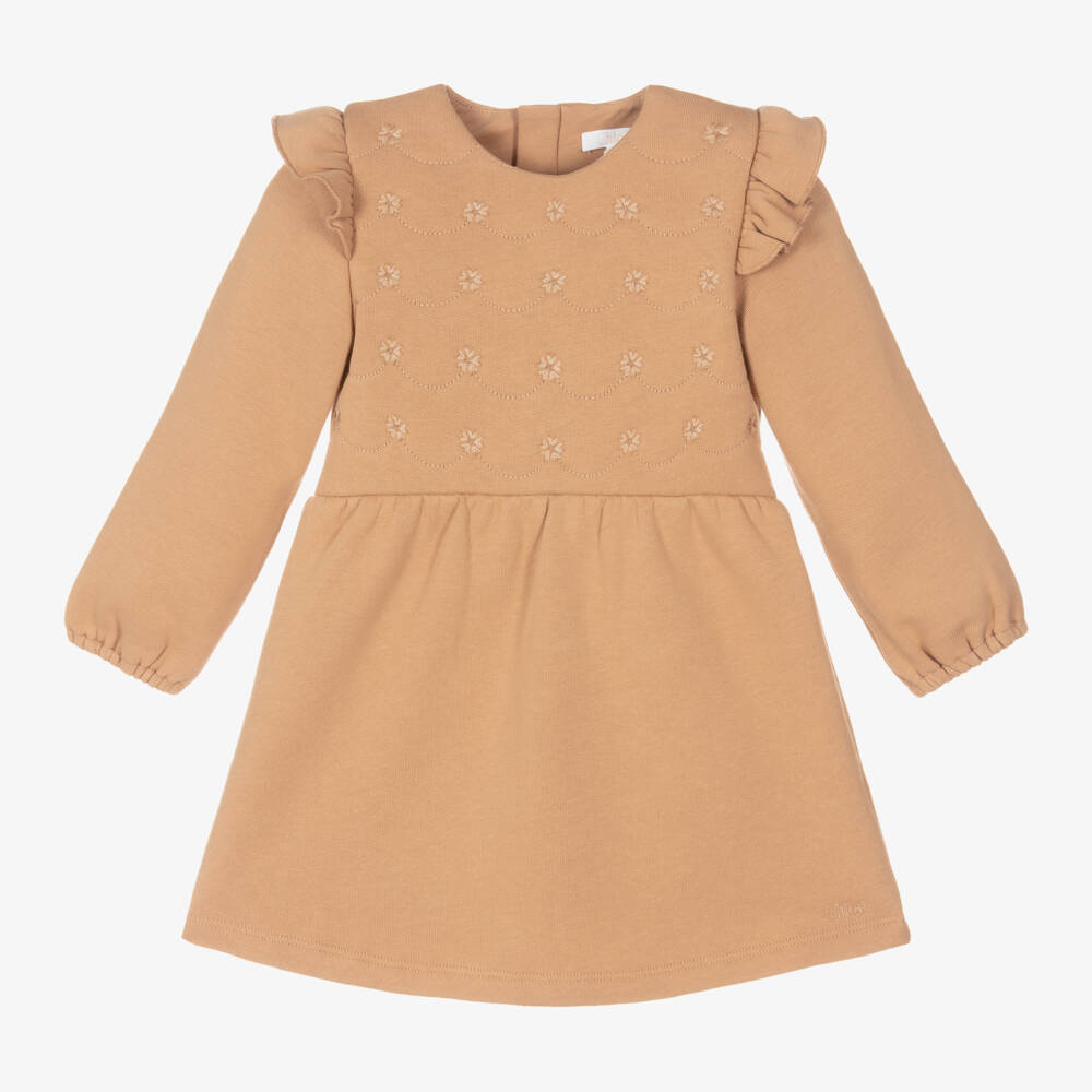 Pretty dark beige dress for little girls by luxury French brand Chloé, made in soft, mid-weight organic cotton jersey with a fleecy underside. Warm and cosy, it has a quilted bodice, with pretty scalloped-effect stitching and iconic embroidered flowers. There are sweet ruffle trims over the shoulders and a concealed zip fastening on the back. The brand's signature tonal logo is embroidered by the hem for a subtle designer finish.