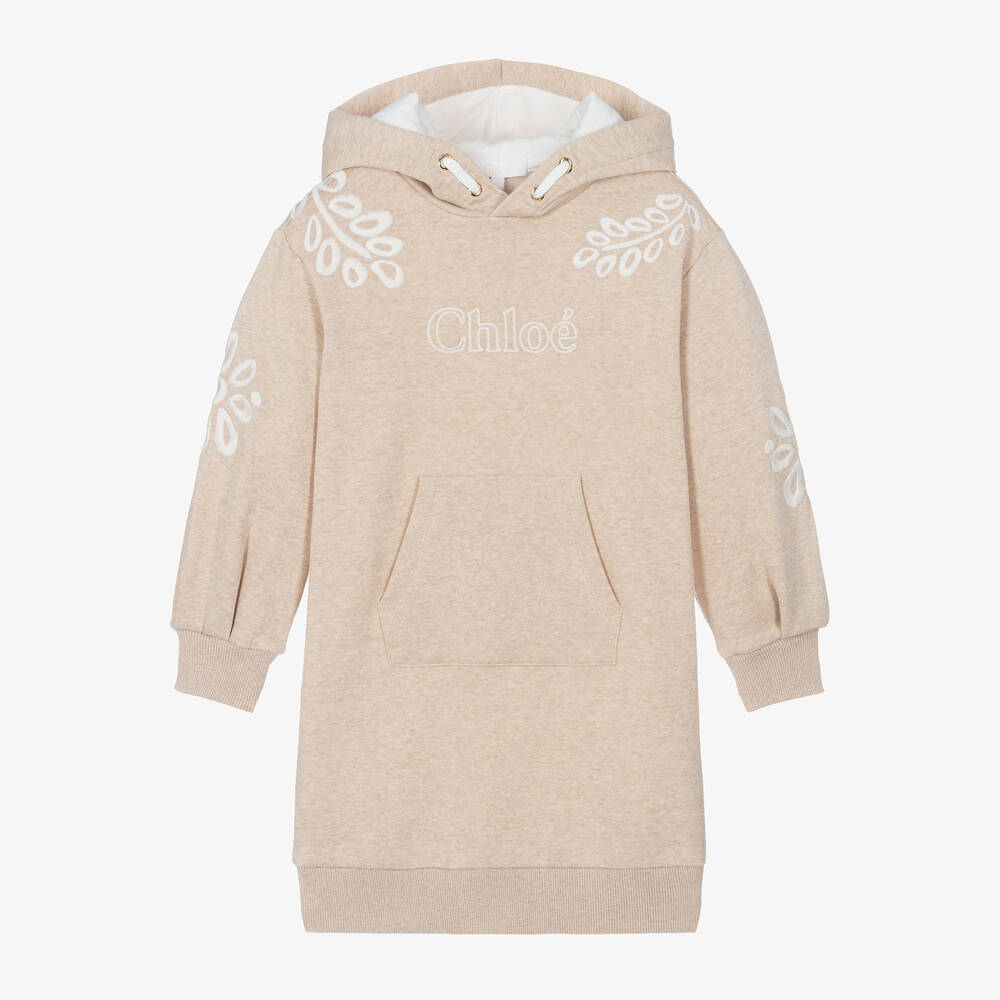 Beige marl sweatshirt dress for girls by luxury brand Chloé, with beautifully embroidered ivory flowers and leaves, and a central signature logo. This casual design is made in soft, organic cotton jersey with ribbed trims and a warm, fleecy inside. It has a fully lined hood with gold eyelets on the neckline and a pouch pocket on the front for keeping hands warm.