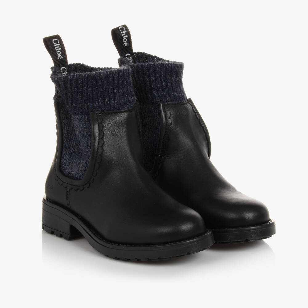 Black ankle boots for girls by luxury French brand Chloé. The uppers are made in soft leather, with navy blue knitted sock-effect trims and a ribbed cuff. Adding a subtle designer statement, there is a black and white logo tape pull on the back of the heel to help pull the boots on. They have a leather lining and insole and chunky non-slip rubber outer soles.