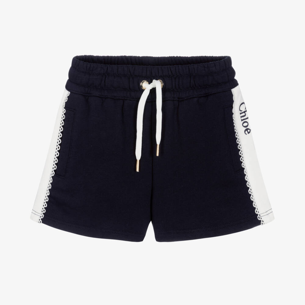 Navy blue organic cotton shorts for girls by luxury brand Chloé. The ivory side panels are trimmed with gorgeous guipure lace and detailed with a Chloé signature logo embroidered in navy blue. Ensuring a comfortable fit, the drawstring waist features shiny gold hardware, engraved with the French designer's name. These comfortable shorts are made in soft and stretchy sweatshirt jersey, with useful side pockets.