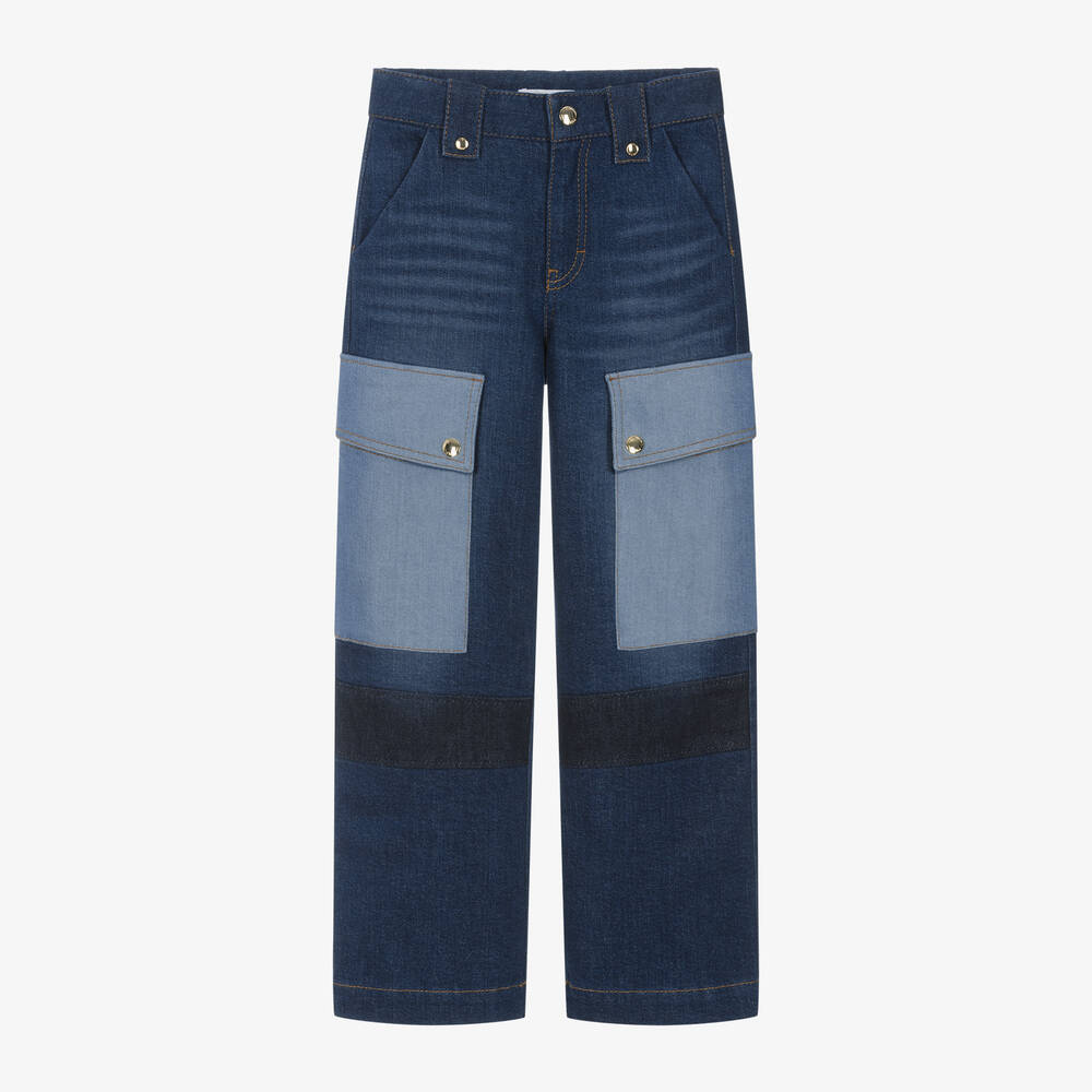 Stylish blue organic cotton denim jeans for girls by luxury French fashion house Chloé. They have contrasting pale blue pockets on the sides and back, with dark blue patches below the knees and orange overstitch detailing. The jeans fasten with shiny, gold, branded poppers and a zip and have an adjustable waistband for a comfortable fit.