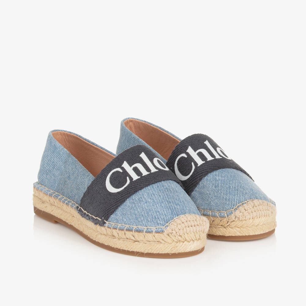 Blue denim espadrilles for girls by luxury fashion house Chloé, a design inspired by the adult collection. In a convenient slip-on style, these easy-to-wear shoes are lined with soft leather for long-lasting comfort. Complementary dark grey woven features with stand-out white branding can be found across the front for instant designer appeal. They have jute midsoles and insoles for that classic espadrille look and a slim rubber outsole for improved grip.