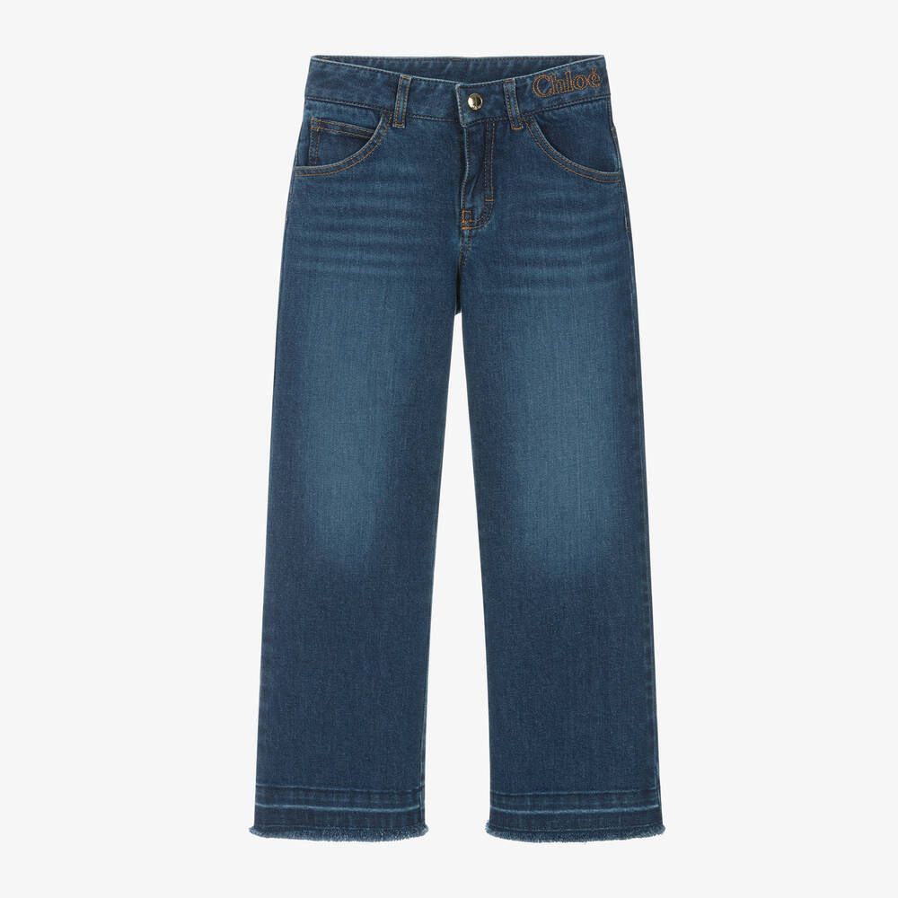 Flared blue organic cotton denim Mini-me jeans for girls by luxury French fashion house Chloé, with stylish, frayed detailing on the cuffs. Soft and mid-weight with classic, five-pocket styling, they have a washed and worn look, with an orange logo embroidered on the adjustable waistband, matching the overstitch detailing. They fasten with a shiny, gold, branded popper and a zip.