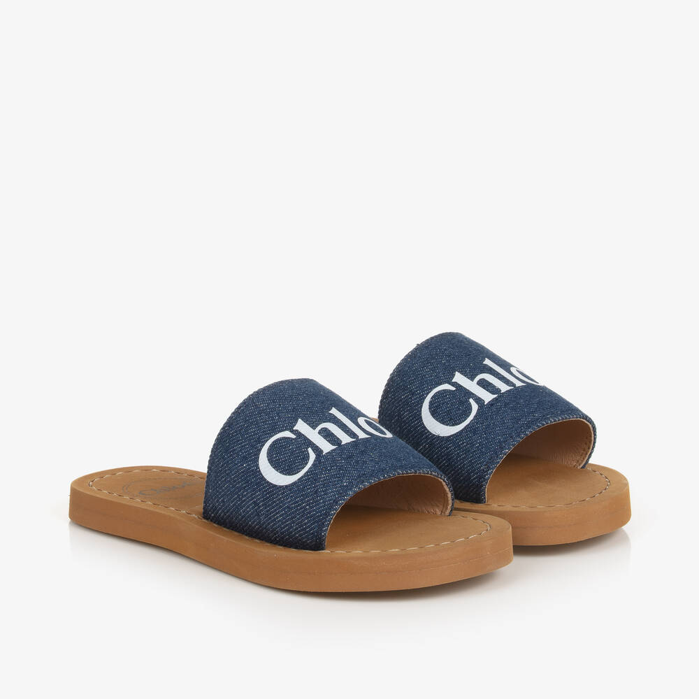 Mini-me blue denim sliders for girls by luxury French brand, Chloé, lined with soft and supple leather. Ideal for stylish casual wear, they are printed with a bold white logo for instant brand recognition. Easy to slip on, they have a comfortable rubber footbed detailed with a stitched trim and logo print, with smooth rubber outer soles completing the look.