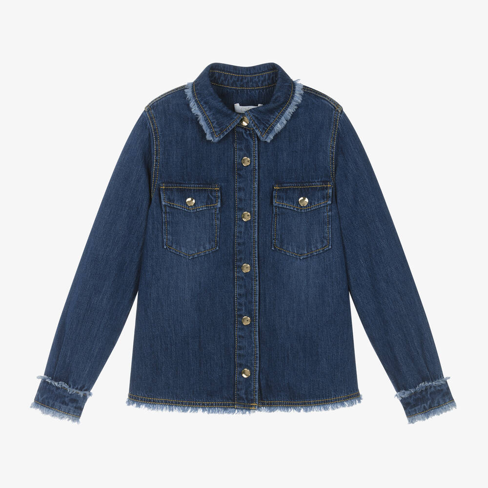 Blue organic cotton denim Mini-me shirt for girls by luxury French fashion house Chloé, with stylish, frayed detailing. Soft and mid-weight with a washed and worn look, it has long sleeves, useful patch pockets on the front and fastens with shiny, golden, branded poppers.