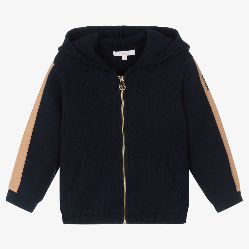 Navy blue casual zip-up hoodie for girls by luxury designer Chloé. Beautifully soft, this organic cotton and wool blend zip up hoodie has beige stripes on the sleeves, with navy blue logo embroidery.