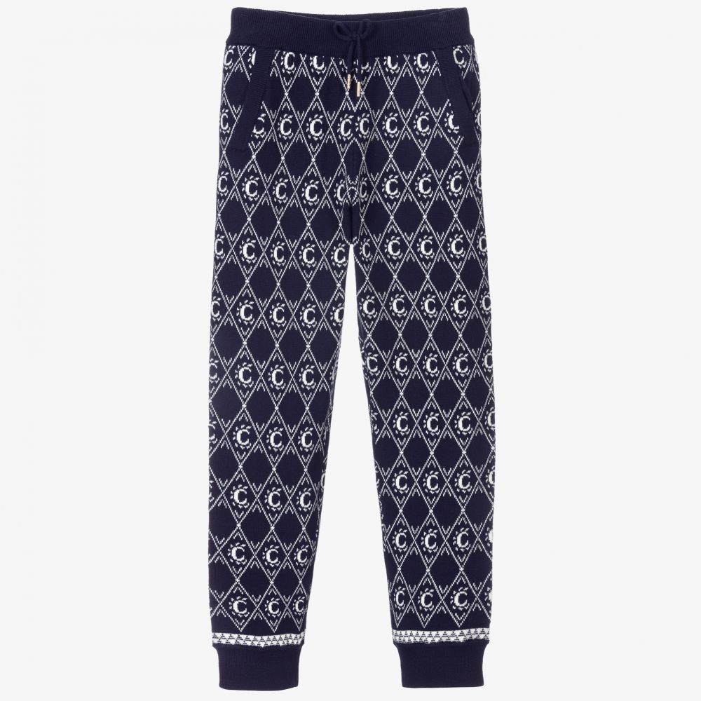 Navy blue, Mini-me knitted joggers for girls by French designer, Chloé. Comfortable and stylish, they are made in a luxurious cotton and wool blend, with the brand's jacquard 'C' logo pattern in white. The elasticated waistband has a decorative bow with branded gold end caps and there are useful pockets on the front.