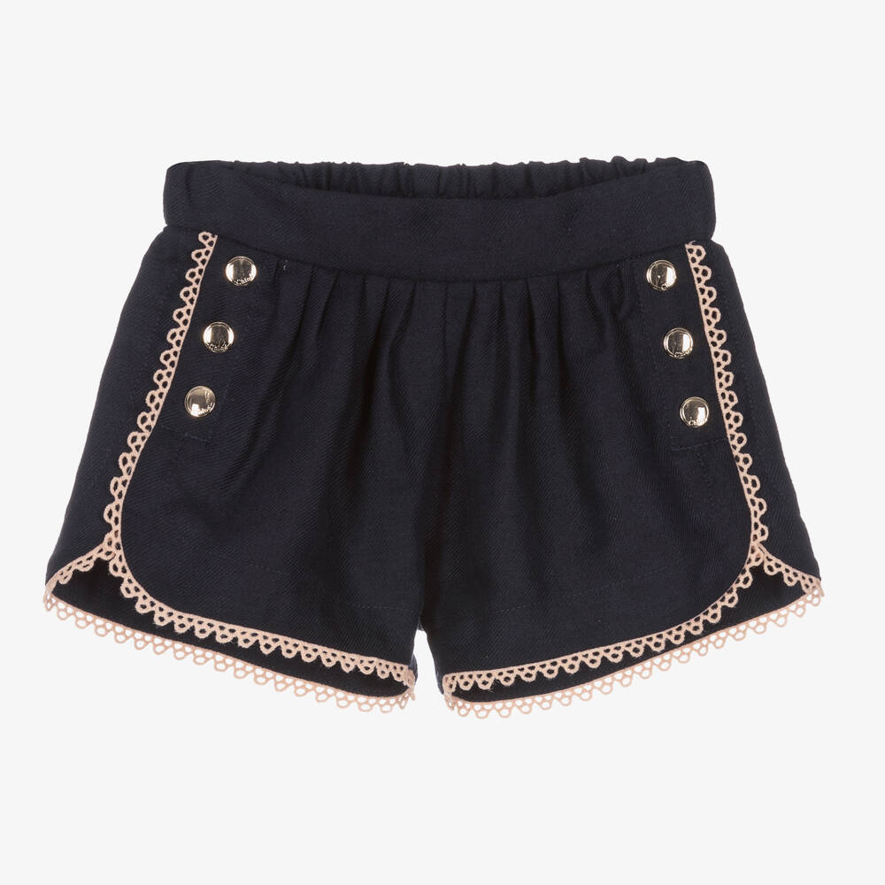 Smart navy blue shorts for little girls from luxury French designer Chloé, with pretty pink guipure lace trim. Made in soft linen and cotton blend twill, they are pleated at the front and have stylish shaped hems. The waistband is elasticated at the back for easy pull-on and branded gold metal studs on the front give a discreet designer finish.