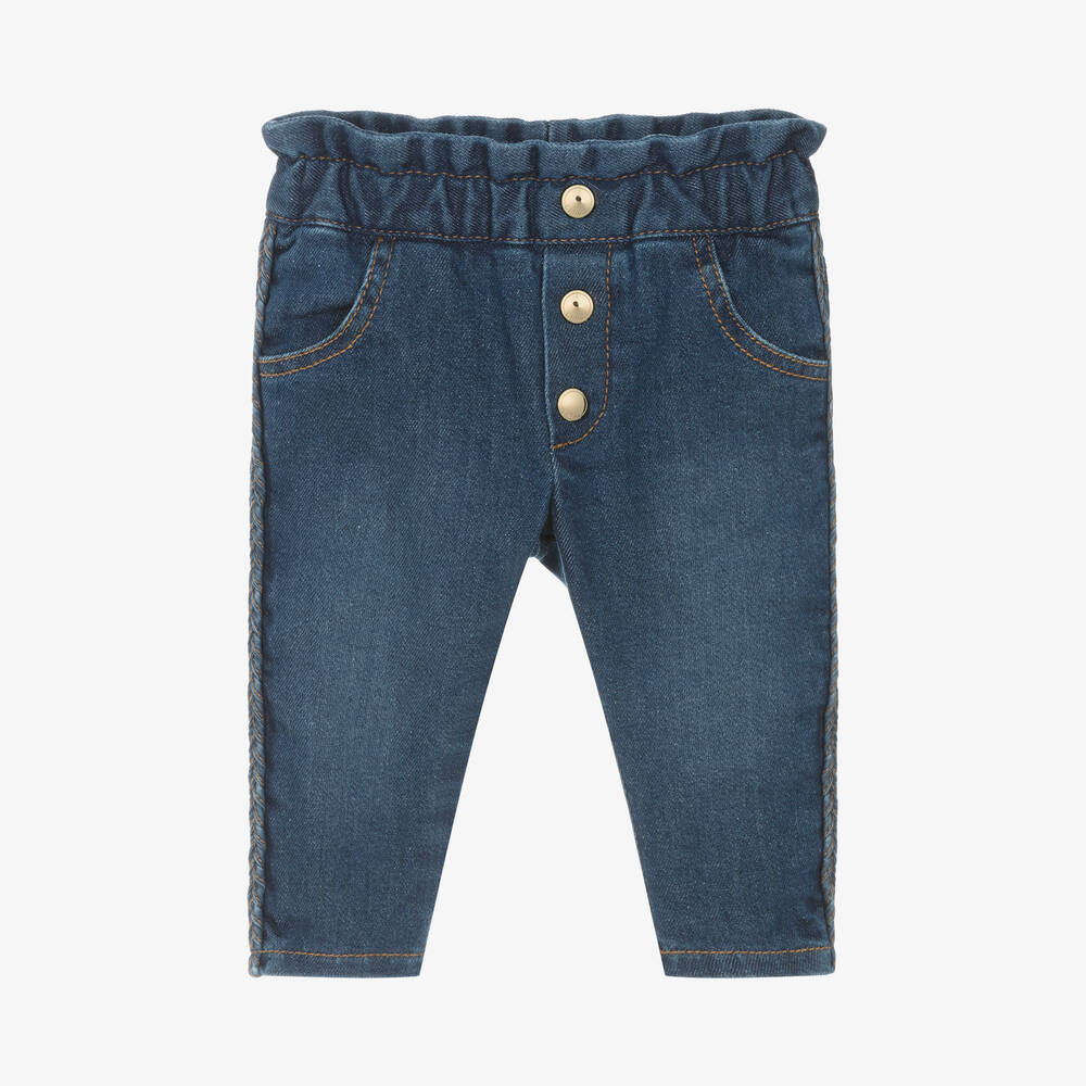 Deep blue denim jeans for younger girls by Chloé, made in organic cotton with a slight stretch for comfort. These four-pocket jeans are designed with boho braided trims and the well-known Chloé logo embroidered on the back in tan brown. Easy to dress your little one, they have an elasticated, paper bag-style waist. A subtle, stylish detail, the gold-hued faux poppers are engraved with branding.