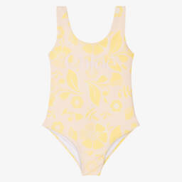 Navy blue and white striped swimsuit for girls by luxury brand Chloé. It has pretty ruffles over the shoulders and a Chloé Paris logo printed on the chest. Silky smooth and stretchy, it is fully lined for comfort and modesty.