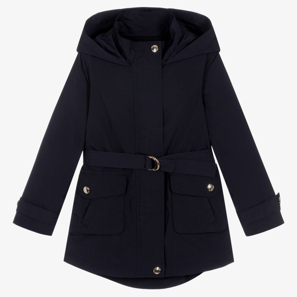 Navy blue water-repellent windbreaker coat for girls by French label Chloé, made with recycled materials. This chic style features shiny golden hardware, engraved with the luxury's brand's logo for a subtle designer touch. Silky, lightweight and comfortable, it is lined with cotton jersey and made in soft fabric with a slight crinkled effect. This hooded outerwear piece has four front pockets, a removable topstitched belt with a branded D-ring buckle and a dipped hem. There is an easy-to-fasten zip beneath the popper-fastening placket on the front.