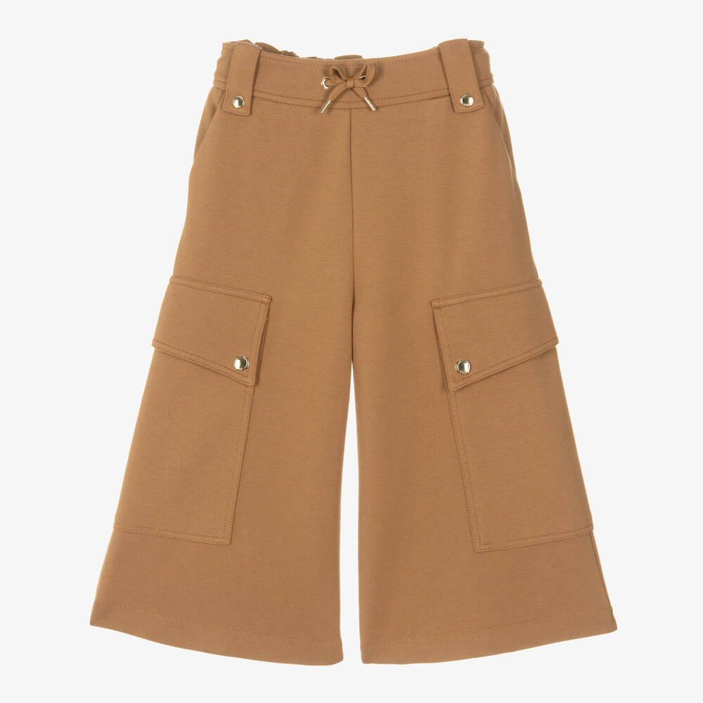 Casual brown culottes for girls by luxury brand Chloé. In a cool cargo style, they are made from soft mid-weight cotton and viscose blend Milano jersey and have deep patch pockets on the legs with gold logo-embossed poppers. They have slanted front pockets and gold, branded details on the elasticated drawstring waist, with belt loops and an embroidered logo on the back for a signature finish.