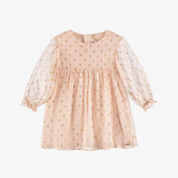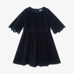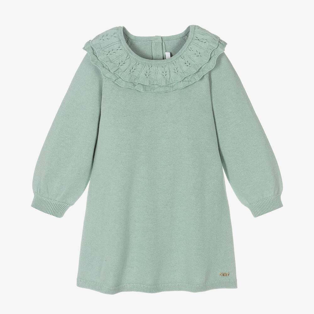 Mint green knitted dress for little girls by luxury French brand Chloé, inspired by the main collection. In a beautifully soft cotton and wool mix, this pretty dress has a pointelle ruffled collar and a gold metal logo on the hem. It has back button fastenings and is finished with ribbed trims. This garment has been made using organic farmed cotton.