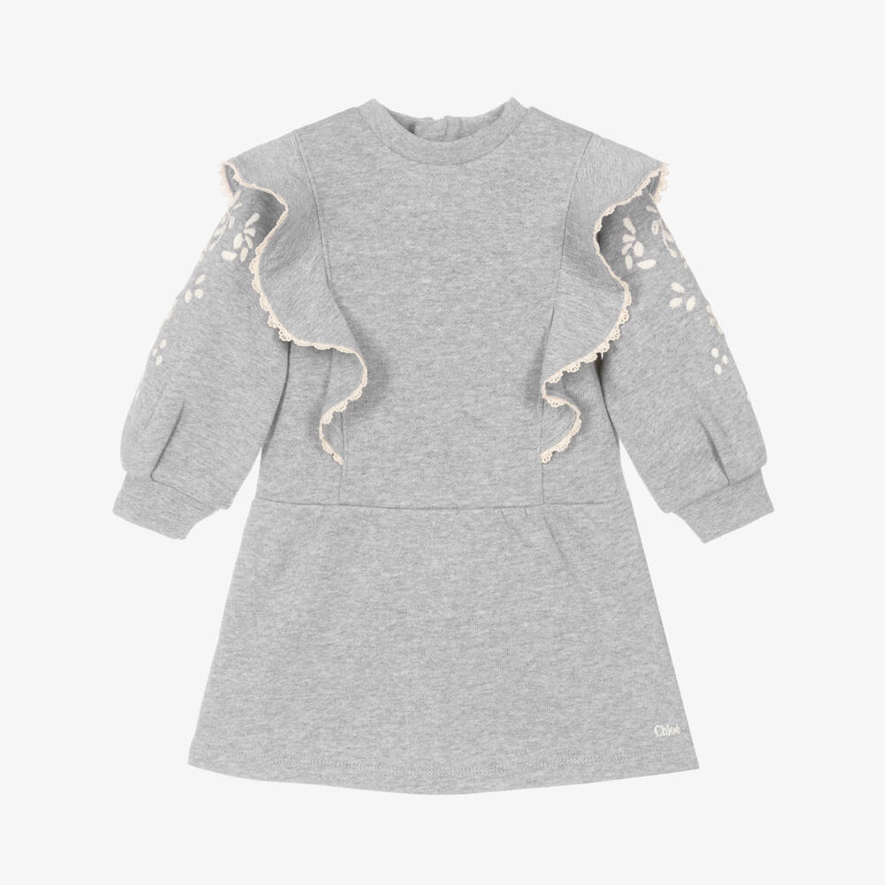 A grey sweatshirt dress for little girls by luxury French designer Chloé, made from the softest organic cotton jersey. It has pretty ruffled trims with ivory lace edging and floral embroidery on the sleeves. The brand's signature logo is embroidered on the hem. There is a neatly concealed zip fastening on the back.