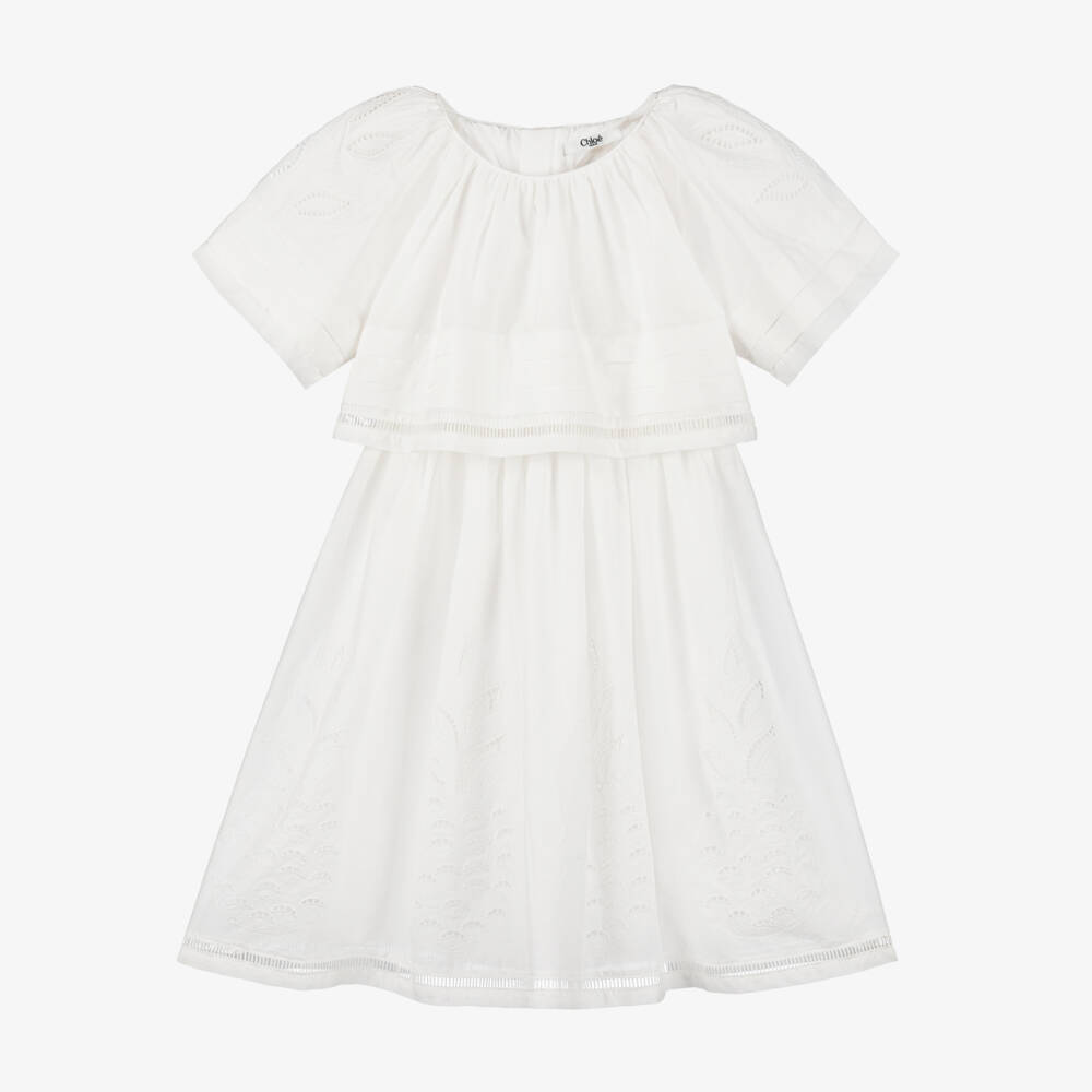 A beautiful ivory dress for girls by Chloé, made in soft and lightweight cotton. Designed with a charming layered look, it features the French brand's archival pineapple motif in delicate embroidered cutwork detail. Pretty pleats and ladder lace trims add extra designer touches and there is a tonal embroidered logo on the bodice. The dress fastens with a zip and buttons on the back.