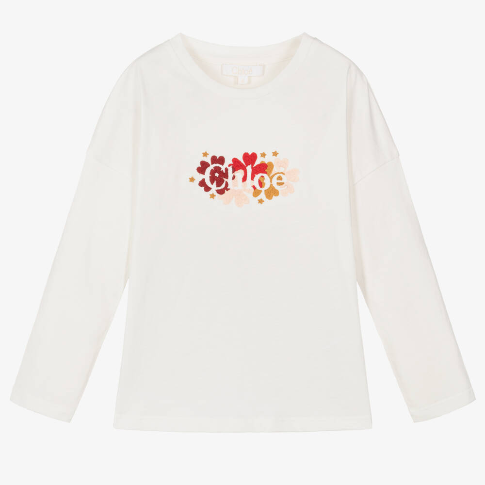 A lovely ivory long-sleeved top for girls by luxury French brand Chloé, made in soft organic cotton jersey. Comfortable to wear, this casual top has a ribbed crew neck and colourful floral logo embroidery on the front for a pretty designer finish.