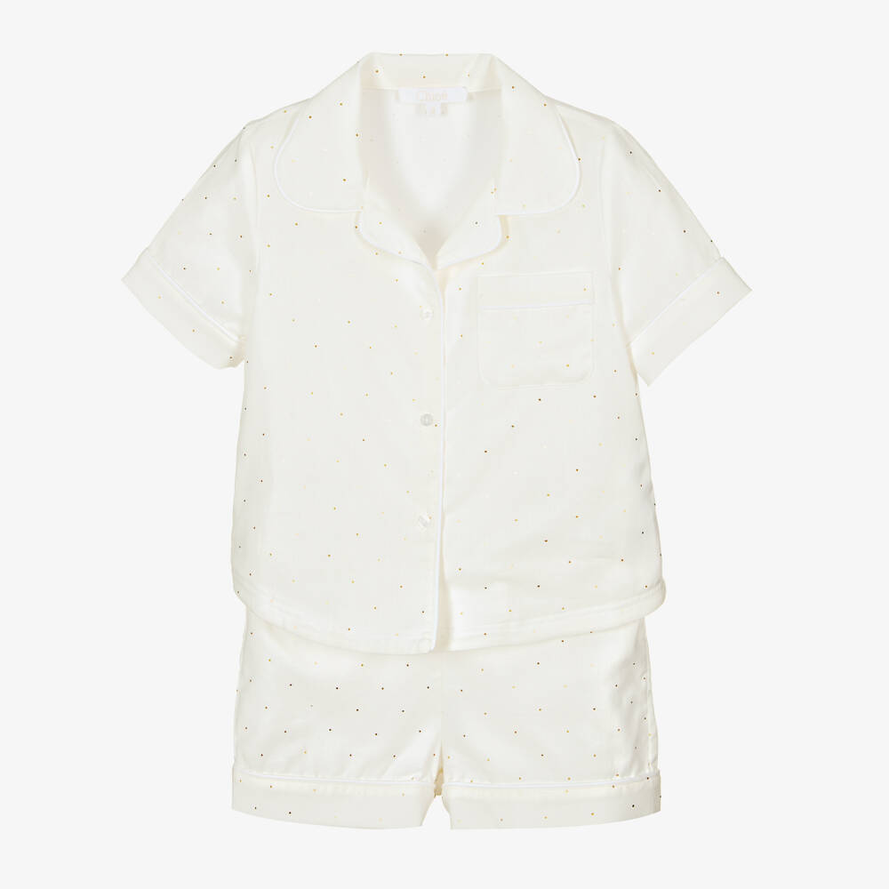 Ivory short pyjamas for girls by luxury designer Chloé, woven in soft cotton twill with a delicate gold spot print. The top has a revere collar and front button fastening, with a chest pocket embroidered with the designer's logo. The matching shorts have an elasticated waistband with faux drawstring and a comfortable, relaxed fit.