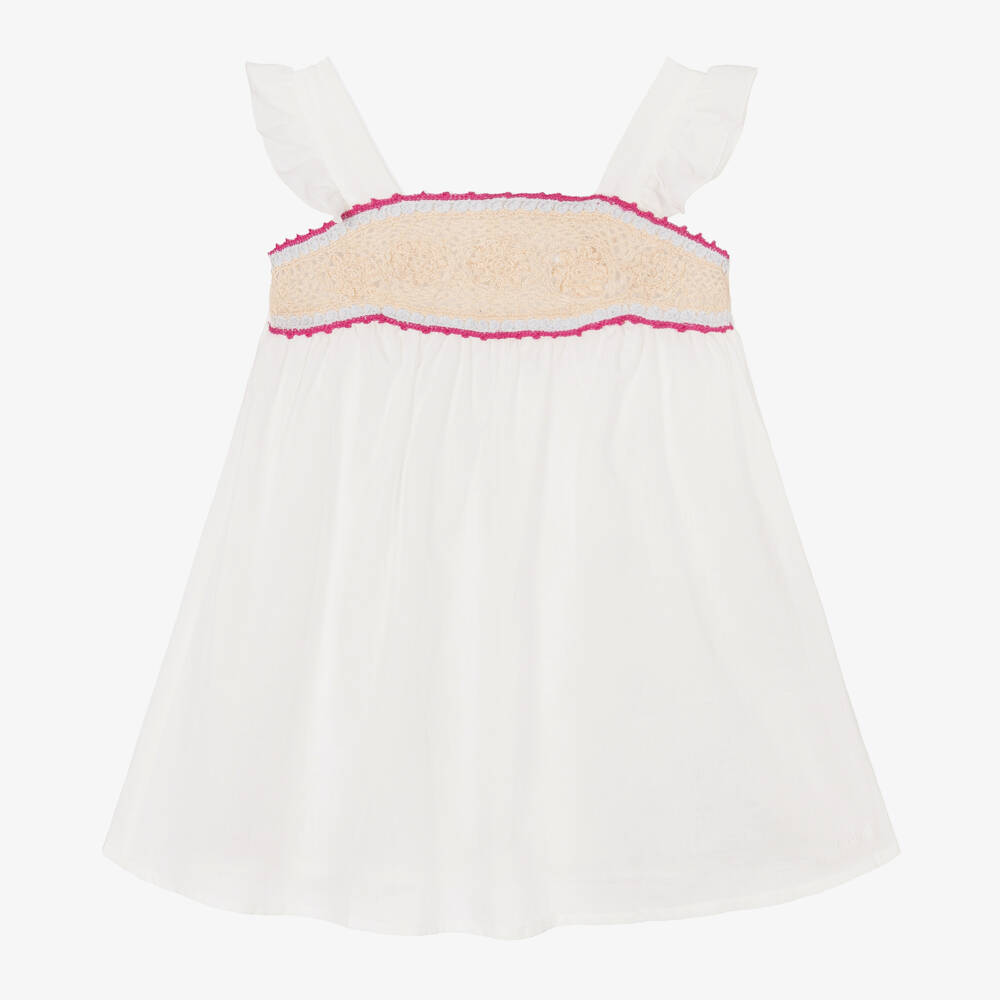 In pale ivory, a delightful sleeveless dress for little girls by French fashion house Chloé. Made in sheer and lightweight organic cotton voile, it has beautiful crochet detailing in beige, blue and red on the bodice, with pretty ruffles on the shoulder straps. This beautiful dress is fully lined for comfort, and fastens with fabric covered buttons on the back. It is discreetly signed with tonal Chloé embroidery at the hem.