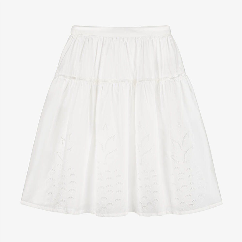 A beautiful ivory skirt for girls by Chloé, made and lined in soft and lightweight organic cotton. Designed with a partial, elasticated waistband for comfort, this gathered style falls below the knee. It is trimmed with ladder lace and features the French brand's archival pineapple motif in delicate embroidered cutwork detail. A discreet tonal logo on the hip completes the look.
