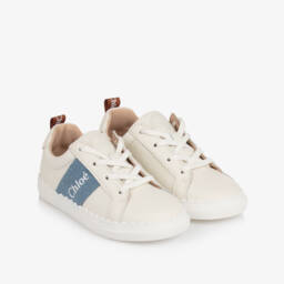 Ivory low-top Mini-me trainers for girls by luxury French brand Chloé, made in smooth leather with laces for fastening. They feature perforated detailing on one side, with an embossed Chloé logo adding a subtle designer touch. Lined in contrasting pale pink leather, they have non-slip rubber soles with scalloped edging for good grip, with a branded grosgrain pull tab for a signature finish.