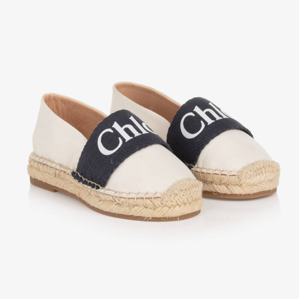 Cute ivory Mini-me espadrille sandals for girls, by luxury French designer Chloé. Woven in soft textile, they have a navy blue grosgrain logo trim across the front. The hessian mid-soles give a seasonal, bohemian-feel to the look, and they have practical rubber outer soles. They are lined in soft leather for luxurious comfort and have a braided trim on the toe.