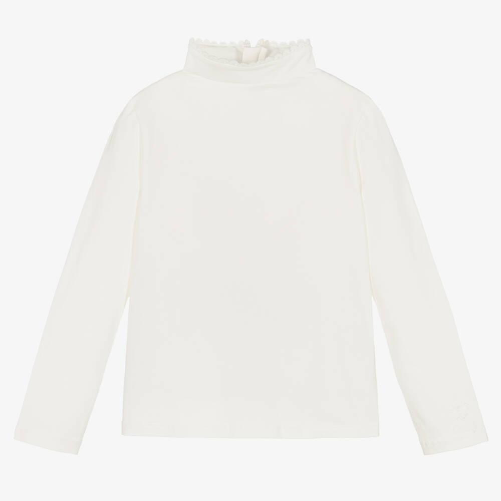 A lovely ivory organic cotton top for girls by luxury French designer Chloé. It has beautiful scalloped embroidery around the stand-up collar and the label's new flower logo and name subtly embroidered on one cuff. It is made in super soft jersey and fastens with a neat, concealed zip around the back that has a branded pull tab.