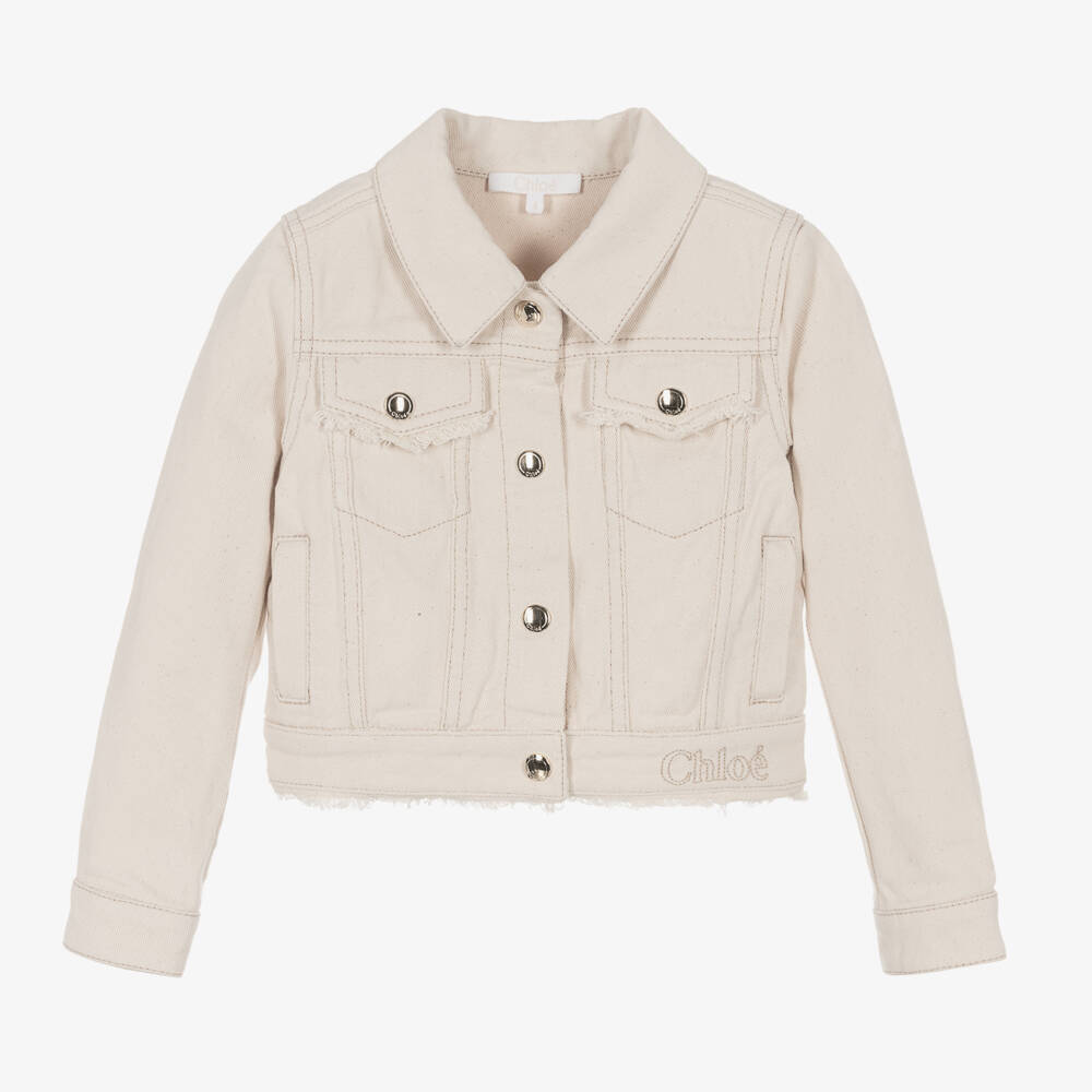 An ivory denim jacket for teen girls by luxury French brand Chloé, with shiny gold branded poppers. This lovely earth-tone jacket is made in soft organic cotton with very fine speckles within the weave. The designer's beige logo is embroidered on the hem, matching the stitching. Frayed edging on the front pockets and hem add a touch of bohemian style to this cool piece.