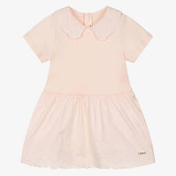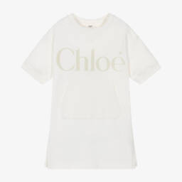 Pretty ivory dress for girls by French brand Chloé. The sheer and ruffled voile sleeves are beautifully embroidered with delicate florals, the signature 'C' logo and scalloped borders in the motifs for a feminine silhouette. Soft and comfortable, it is made in organic cotton jersey with a gold tone button to fasten on the back. There is a little tonal logo embroidered by the hem.