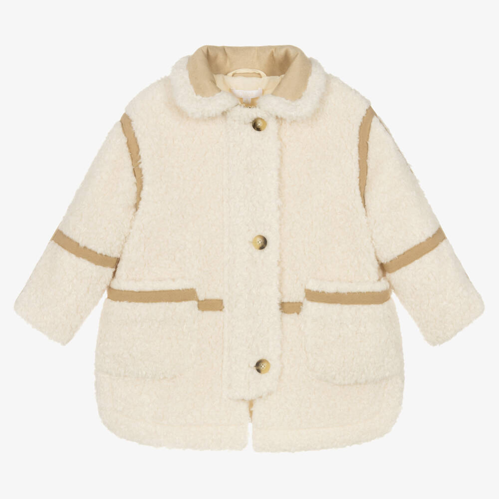 A stylish ivory sherpa fleece coat for girls by French designer Chloé, made with recycled materials. Cute and cosy, this luxurious coat has a beige faux suede collar, chevron-weave trims, and tortoiseshell button fastenings. There are pockets and a concealed gold zip on the front, with smooth cotton twill lining.