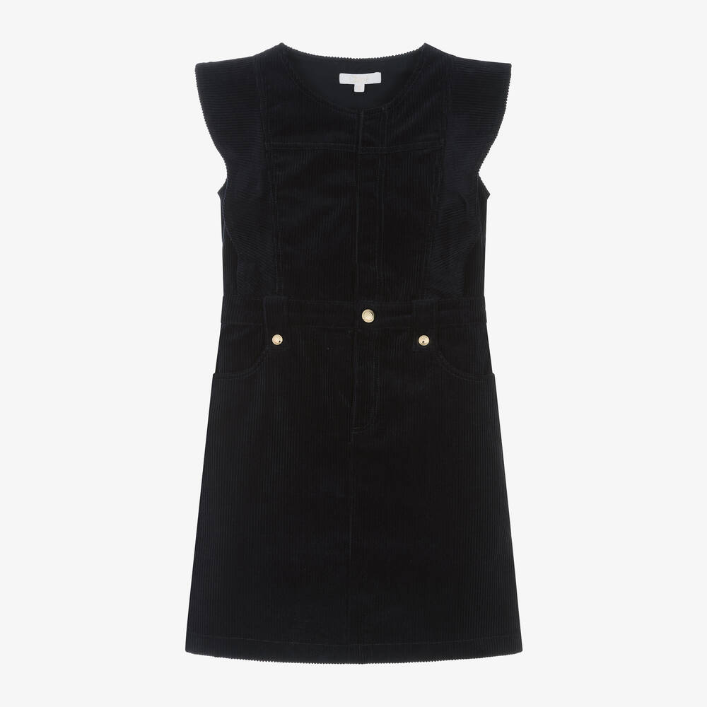 Navy blue organic cotton corduroy dress for girls by luxury French fashion house Chloé, with ruffles on the bodice and over the shoulders. It fastens with concealed poppers and a zip on the front, as well as a shiny, golden, branded popper on the waist, which has matching, decorative poppers on the belt loops. The dress has four pockets and an embroidered logo around the back.