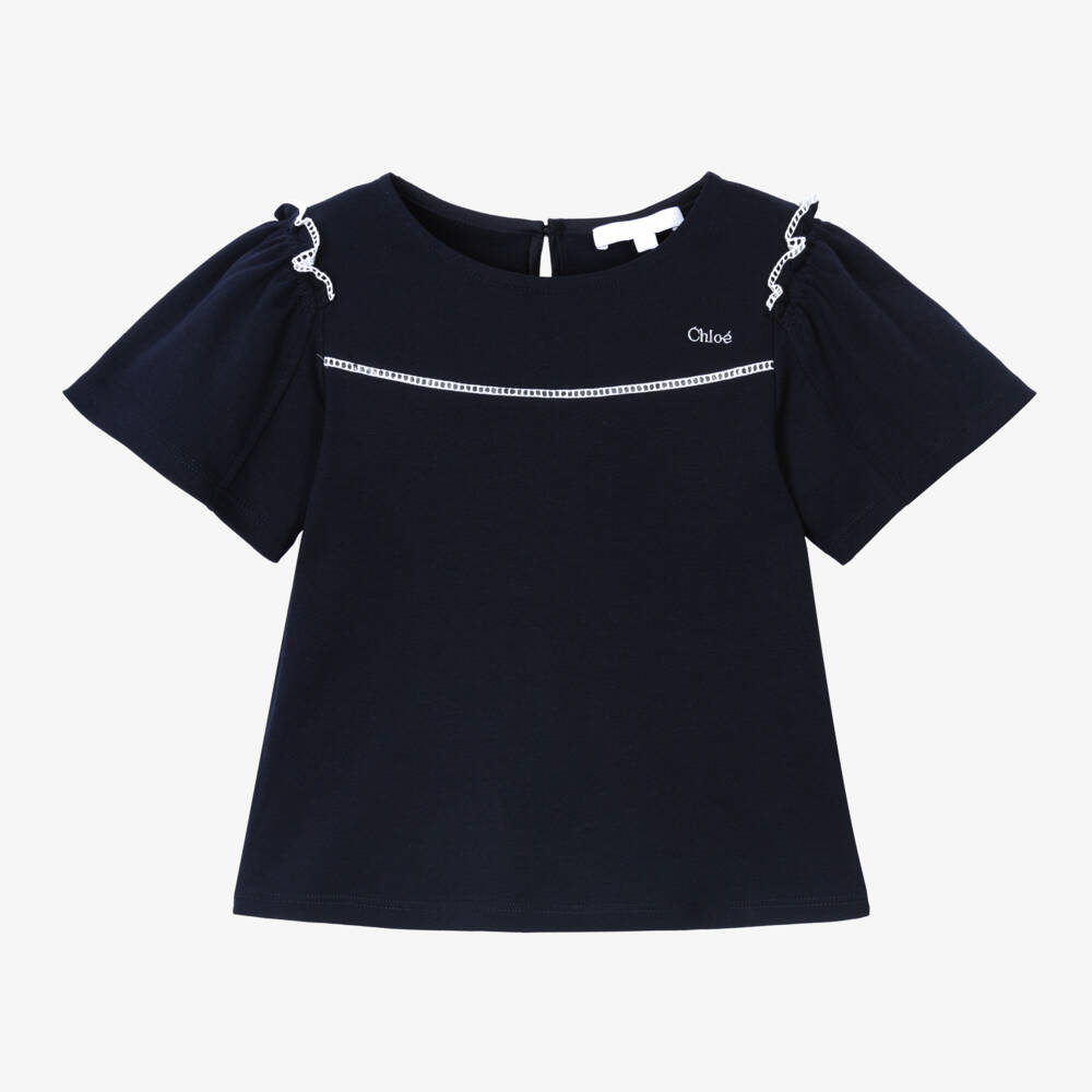 A lovely navy blue T-shirt for girls by luxury designer Chloé, made in soft and stretchy organic cotton jersey. Styled with wide short sleeves, this top is detailed with white ladder lace on the bodice and shoulders, nodding to the brand's bohemian heritage. Logo lettering is embroidered on the front in white and a keyhole button fastens simply on the back.