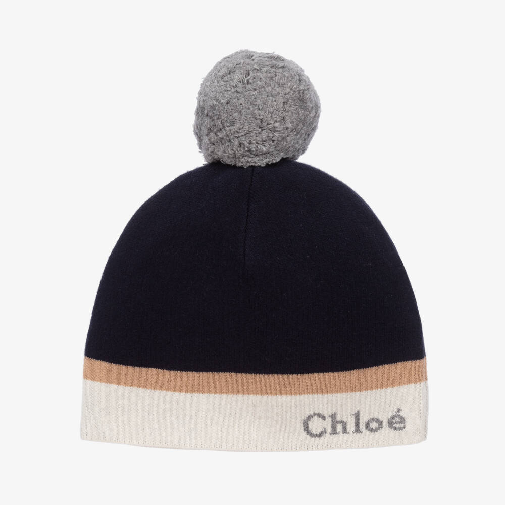 Navy blue organic cotton and wool hat from luxury label Chloé, made in a super-soft and cosy knit. Striped in ivory and beige, this lovely design is enhanced by an intarsia signature logo and a fluffy grey pom-pom on the top.