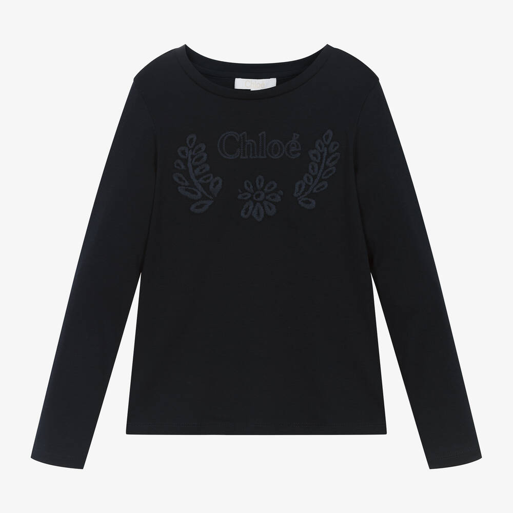 Navy blue top for girls by Chloé, soft and comfortable in organic cotton jersey. With signature detailing from the French fashion house, the front is embroidered with romantic florals and the Chloé logo, all in tonal blue.