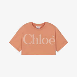 Stylish, Mini-me orange T-shirt for girls by luxury French brand Chloé, made in soft cotton jersey. This short-sleeved tee has a relaxed, boxy fit and dropped shoulders with a slightly cropped look. A large signature logo is printed across the front in contrast white for instant brand recognition.