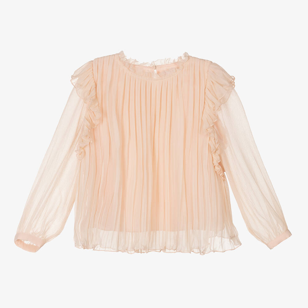 Dainty pale pink silk blouse for girls designed by Chloé, made from gorgeous lightweight and floaty silk and lined in breathable cotton. The feminine bodice is elegantly pleated and there is a delicate frill around the neckline. The sheer, flowing sleeves have a small cuff and the armholes are decorated with beautiful ruffles. There is a keyhole button fastening at the back and a subtly embroidered Chloé logo near the hem line.