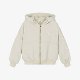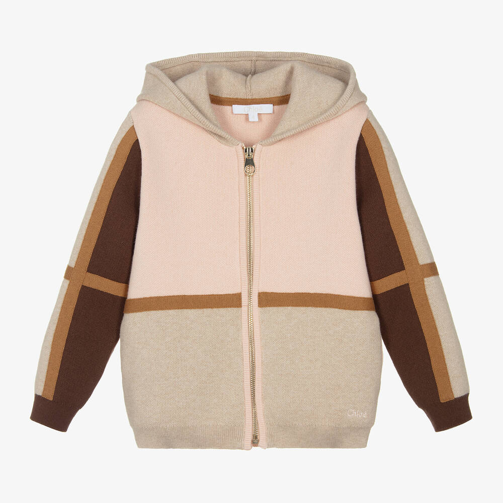 A gorgeous zip-up hooded top for girls by French label Chloé, in a pink, beige and brown colourblock design. Knitted in a luxuriously soft organic cotton and wool blend, it has gently ribbed trims and useful, concealed side seam pockets. The gold-tone zip fastening has a logo-engraved pull and there is a pink embroidered logo above the hem for a subtle branded finish.