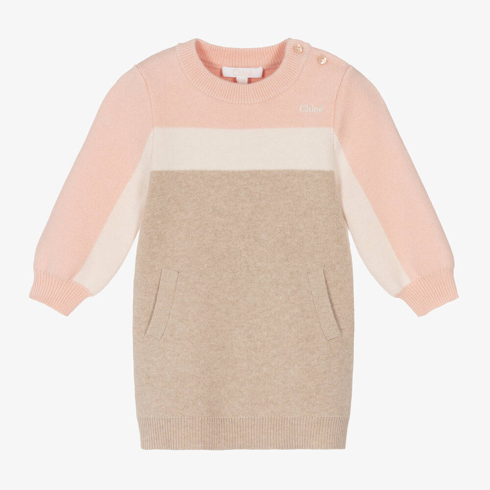 In pretty shades of pale pink, ivory, and beige, this long-sleeved colourblock sweater dress for little girls is by luxury brand, Chloé. Knitted in a cosy blend of organic cotton and wool, it has a white logo detail subtly embroidered on the chest. Fastening with branded buttons on one shoulder, there are useful pockets on the front to complete this sweet style.