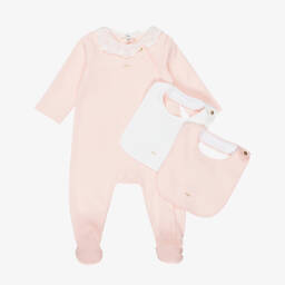 This delightful pink babysuit set for girls by Chloé, is made in soft cotton jersey. The babygrow has a pretty white collar with floral embroidery and scalloped edges. It fastens on the front with concealed poppers and comes with two bibs, one in pink and one in white, which have an absorbent towelling lining and a gold-tone popper fastening on one side. All three pieces feature a delicate gold logo on the front for a statement finish. Ideal as a present for a new baby, the set comes in a beautiful gift box.