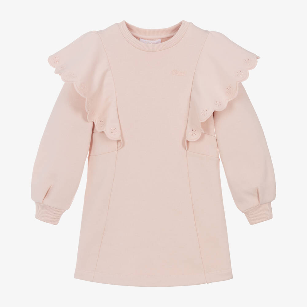 A gorgeous pale pink organic cotton sweatshirt style dress for girls, by luxury French fashion house Chloé. Designed in a gentle A-line shape, it is made in comfortable jersey with a soft, fleecy inside and lightly ribbed trims on the neckline and cuffs. There are large, scalloped frills on the bodice detailed with beautiful, floral broderie anglaise and, for a signature look, tonal logo embroidery can be seen on the chest.