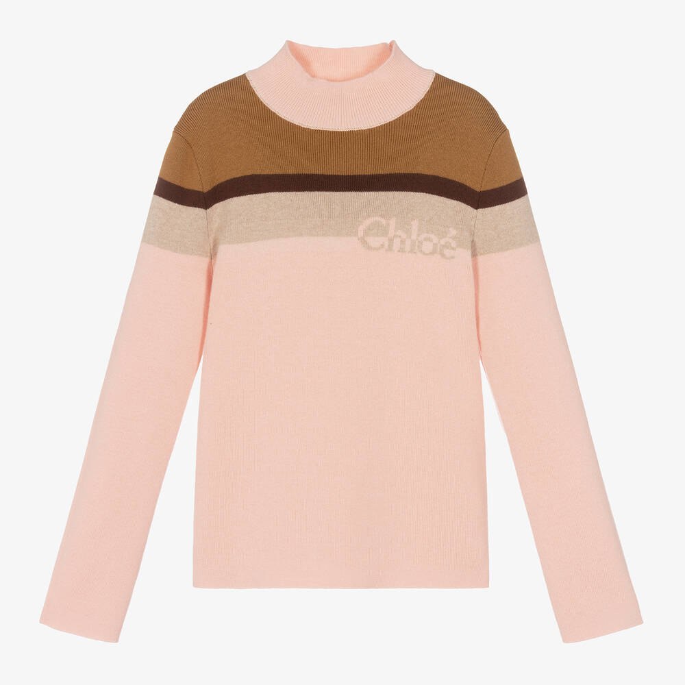 A lovely pale pink long-sleeved jumper for girls by luxury brand Chloé, knitted in a beautifully soft blend of organic cotton and wool. It has a contrasting striped design cross the shoulders in a medley of brown shades, with an intarsia logo adding a signature finish. Comfortable to wear, this stylish top has a cosy high neckline.