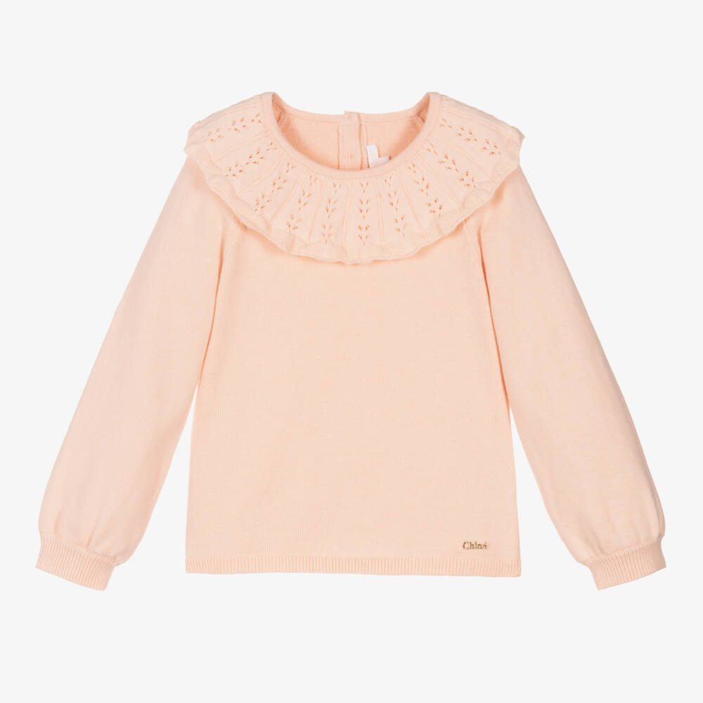 Inspired by the adult collection, this lovely pink sweater for little girls is by luxury French brand Chloé. Beautifully soft, it is knitted in a blend of wool and organic cotton, with a pretty patterned scalloped collar. Adding a signature designer touch, it fastens with logo-engraved buttons on the back, and has a gold metal Chloé plate on the front hem.