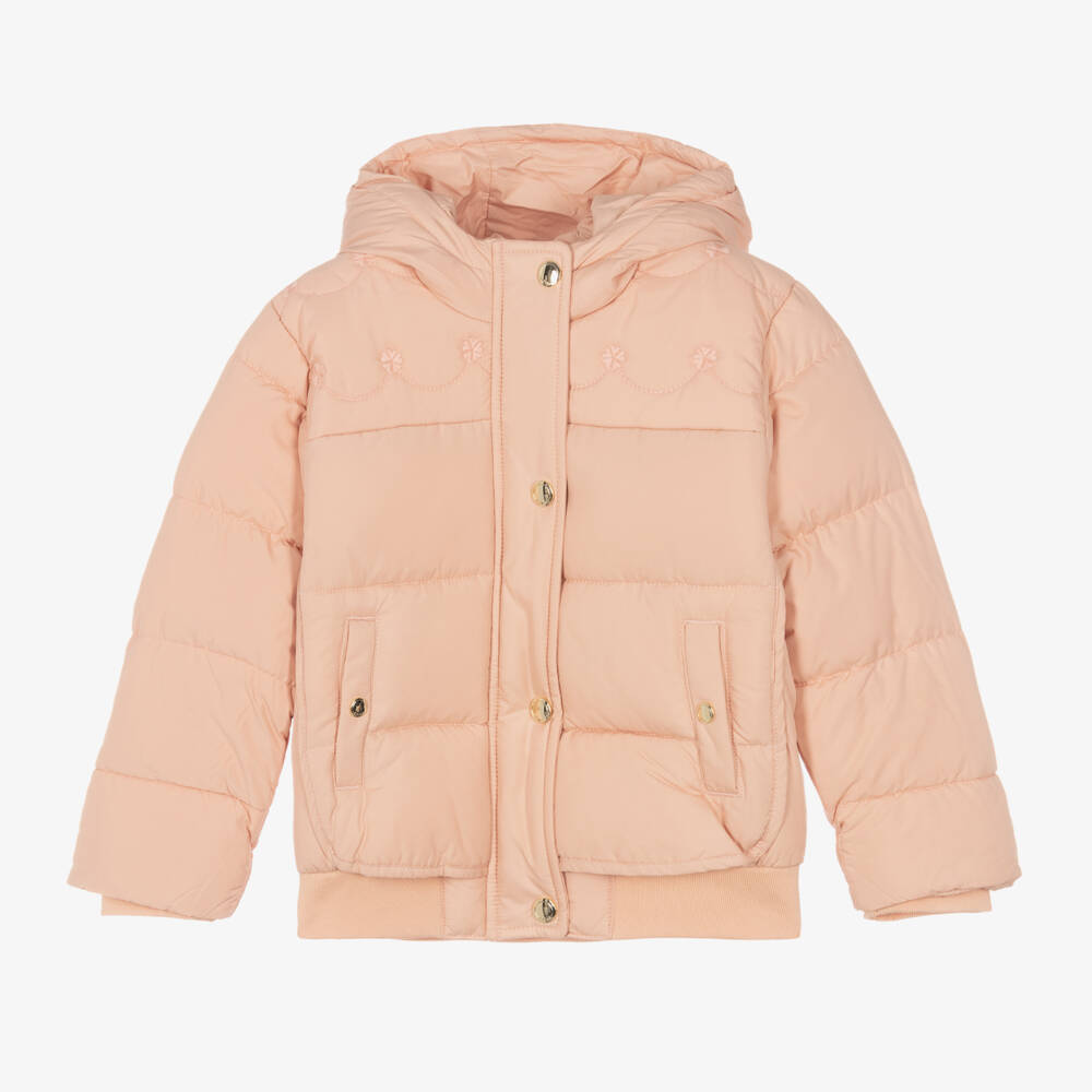 A luxurious pink zip-up puffer jacket for girls by French designer Chloé, made in silky smooth recycled fabric. This cosy hooded style has embroidered flowers on the chest and logo-embossed gold-tone popper fastenings on the front and pockets. Soft ribbed trims offer added protection from the cold.