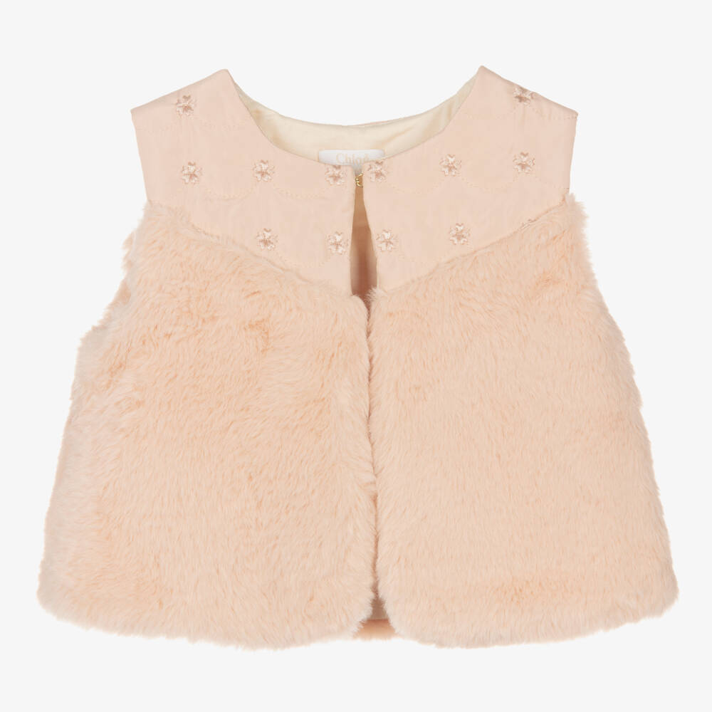 Gorgeous pale pink gilet for little girls by luxury French designer Chloé, lightly padded for warmth. The top part is made in beautiful quilted satin, embroidered with the label's new floral branding, whilst the lower part is made in super soft faux fur. The gilet is lined in ivory cotton voile for comfort and fastens with a discreet, golden hook and eye under the chin.