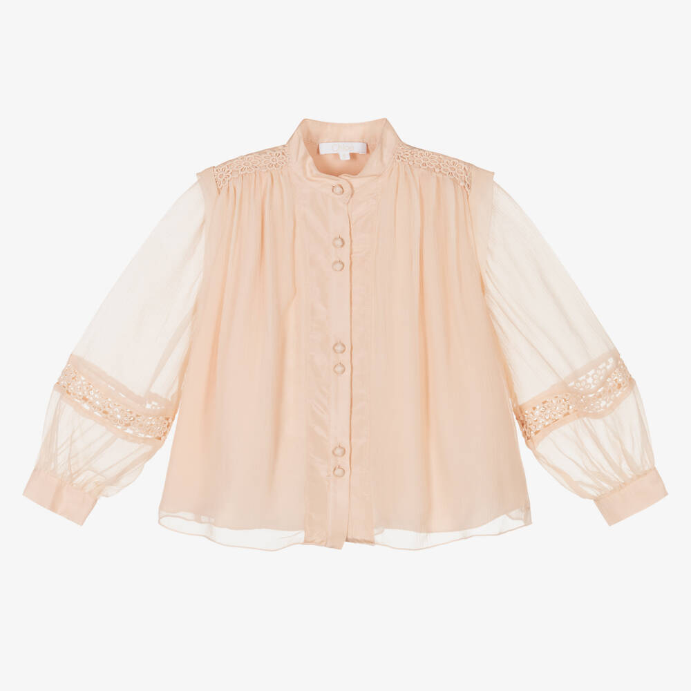 Mini-me pale pink blouse for girls by luxury French designer Chloé. Made in beautifully soft, sheer silk chiffon, it has a silk satin panel with covered front button fastenings. The shoulders are detailed with cut-out guipure lace, which is carried down the sleeves. The hem is discreetly embroidered with the brand's logo and it is fully lined in soft viscose voile.