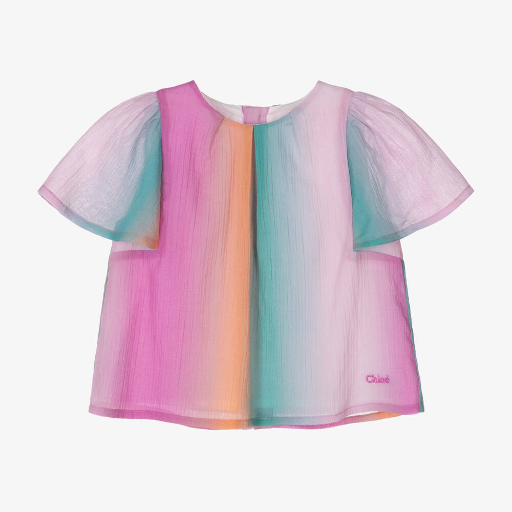 In shades of green, pink and orange, a beautiful ombré-effect short-sleeved blouse for little girls by luxury French fashion house Chloé. Made in semi-sheer cotton voile with a slight crinkled look, it has elegant pleats at the neckline, with feminine flutter sleeves. Lined in lightweight cotton, it fastens with fabric covered buttons on the back and is discreetly signed with Chloé embroidery at the hem.