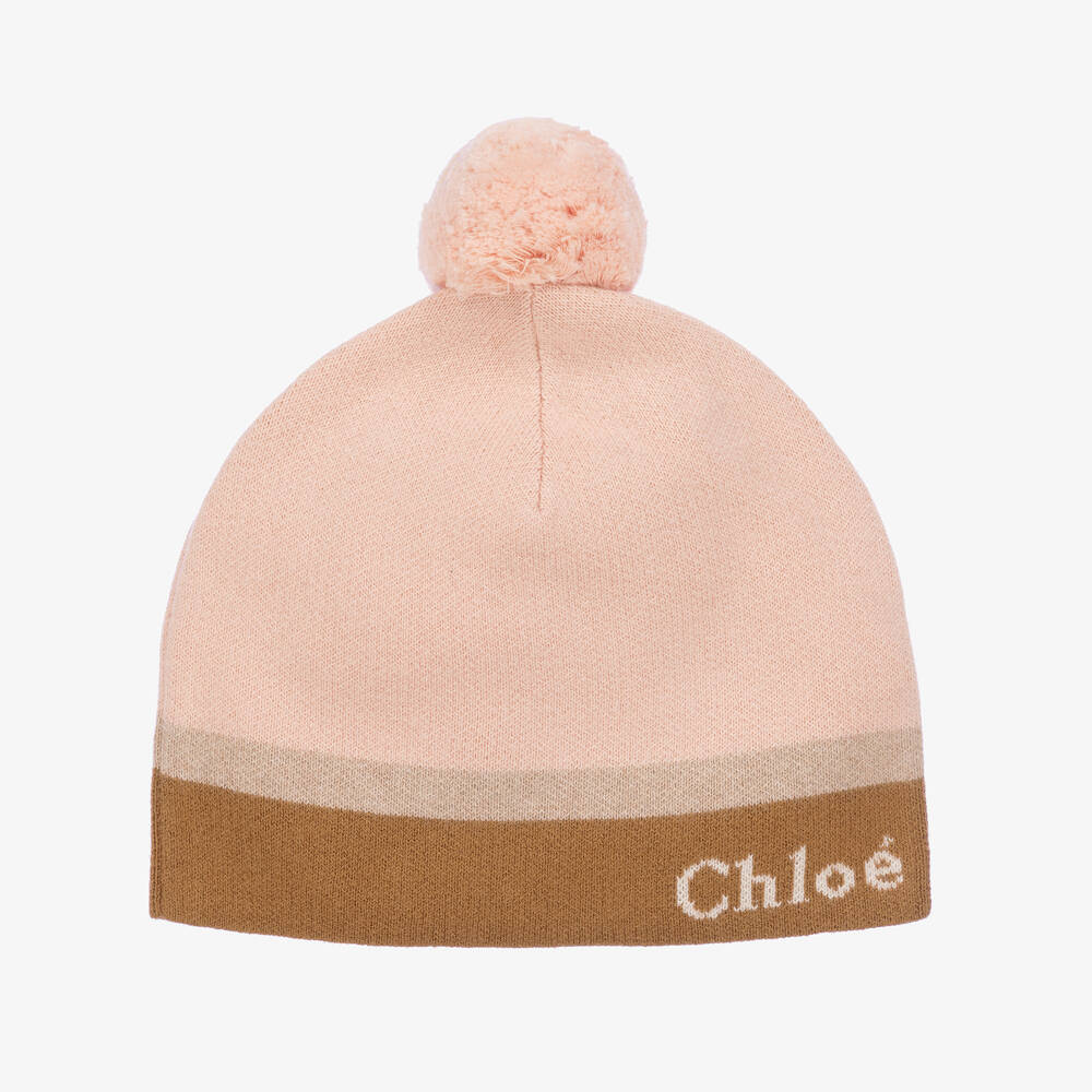A pink pom-pom hat for girls from luxury label Chloé, knitted in a soft organic cotton and wool blend. Striped in dark beige and ivory, this signature design has an intarsia logo on the front for instant brand recognition.
